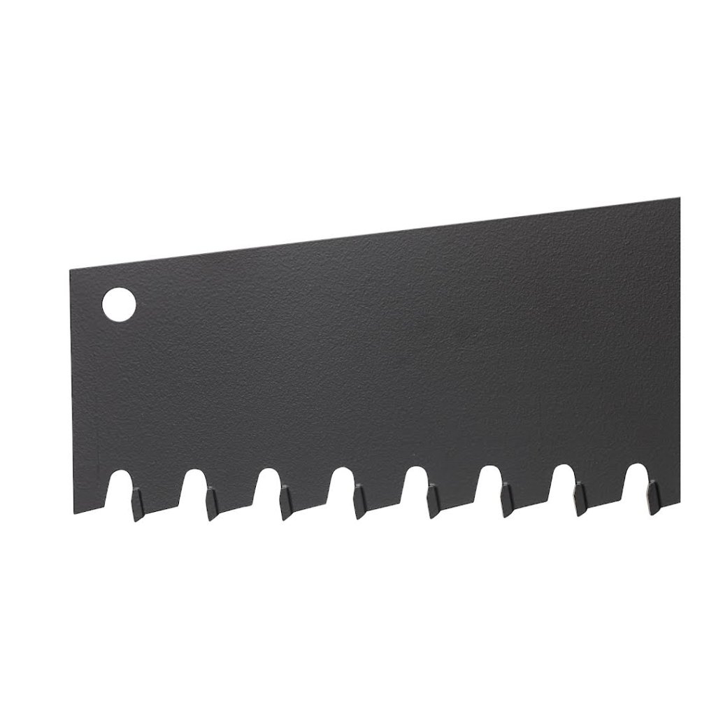 Základem pily je 700 mm dlouhá čepel vyrobená z 1,6 mm silné oceli C75, která zajišťuje mimořádnou stabilitu a přesné vedení řezu bez prohýbání. Čepel je osazena 34 zuby s karbidovými hroty, které si udržují dlouhotrvající ostrost a zaručují hladký a efektivní postup i v nejtvrdších materiálech. Pro zvýšení životnosti je povrch čepele opatřen černým lakem, jenž ji chrání proti korozi a snižuje tření.