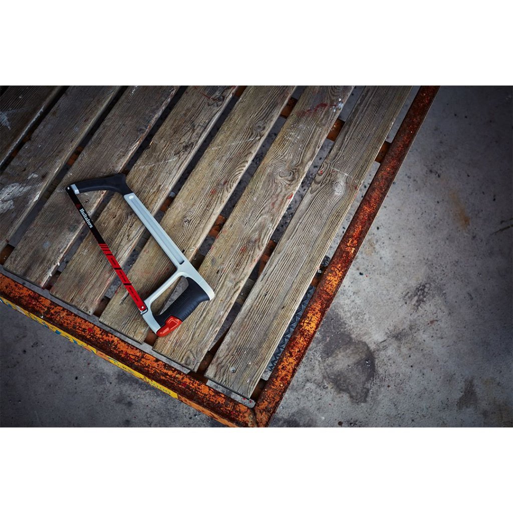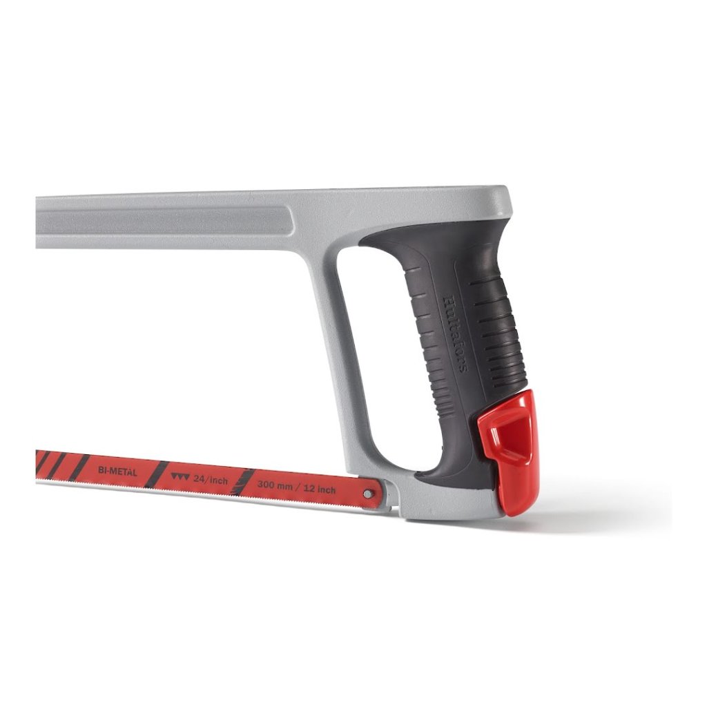 Model HMX-12 má pevný, kompaktní rám z litého hliníku, který je lehký, ale přitom velmi pevný. Ergonomicky tvarovaná rukojeť s gumovým povrchem poskytuje bezpečný a pohodlný úchop oběma rukama, což výrazně snižuje únavu i při delší práci. Díky pružinovému napínáku je výměna pilového listu rychlá a snadná, přičemž vždy udrží velmi vysoké napnutí listu pro čisté a přesné řezy.
