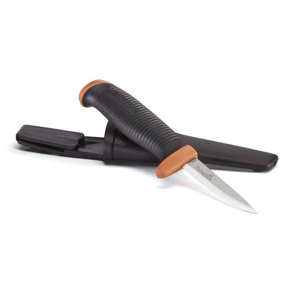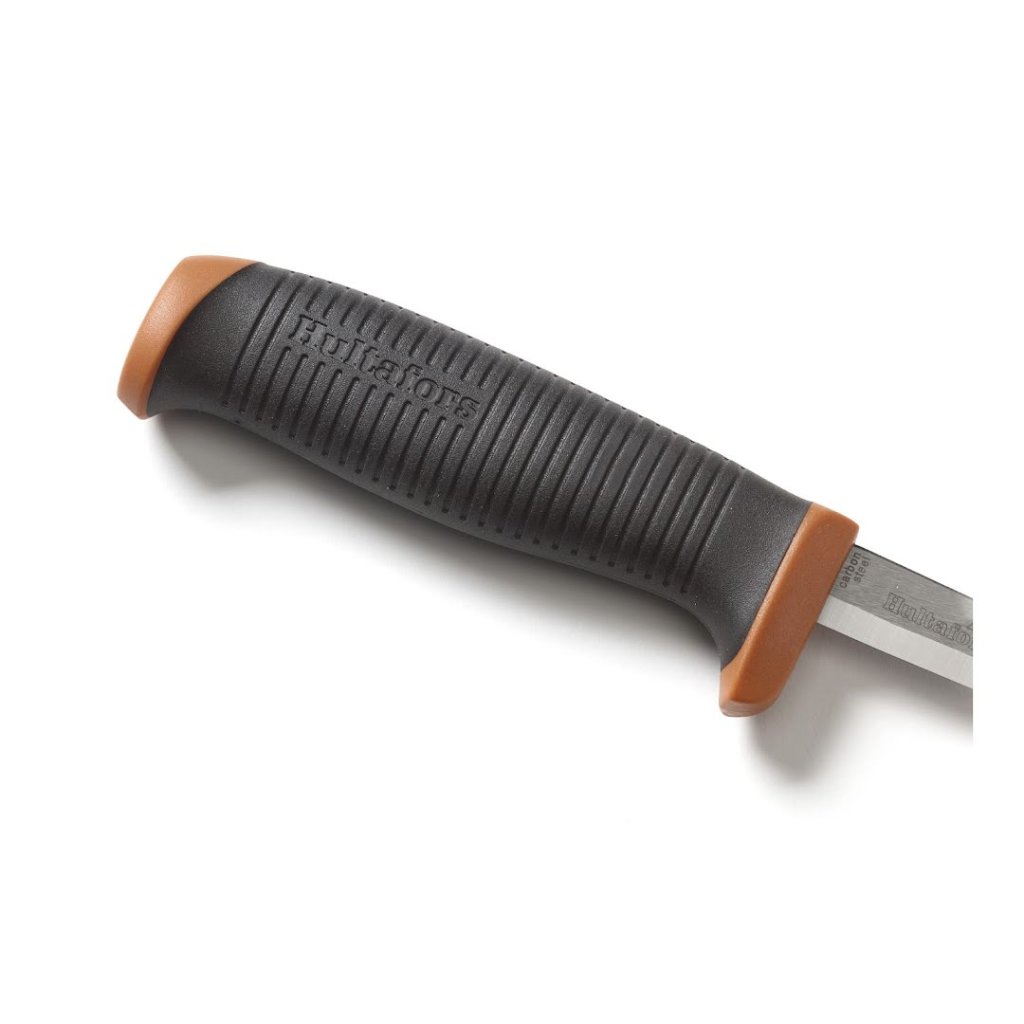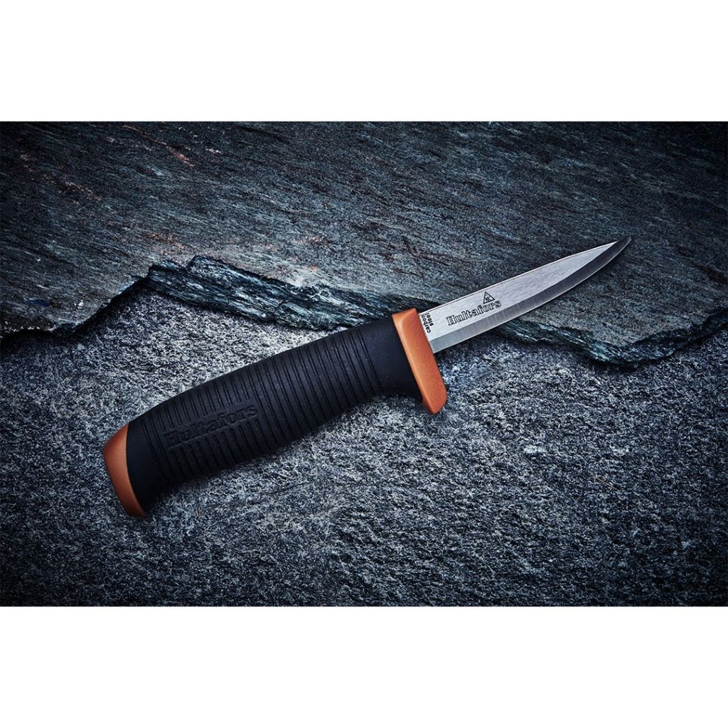 Srdcem nože je 2 mm silná čepel vyrobená z vysoce kvalitní japonské uhlíkové oceli, která zaručuje mimořádnou odolnost a dlouhotrvající ostrost. Každá čepel prochází vícestupňovým procesem broušení a je finálně leštěna na koženém pásu, což jí dodává extrémní ostrost hned po vybalení. Rukojeť je vyrobena z odolného PP plastu a potažena vrstvou Santoprene, která zajišťuje vynikající přilnavost a pohodlí i při dlouhodobé práci. Součástí je praktické pouzdro, které lze snadno připevnit na opasek nebo knoflík u pracovních kalhot, takže máte nůž vždy bezpečně po ruce.