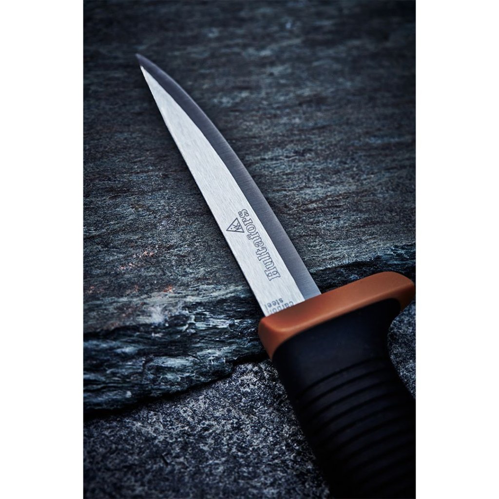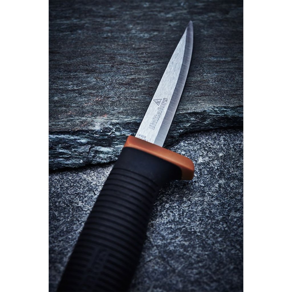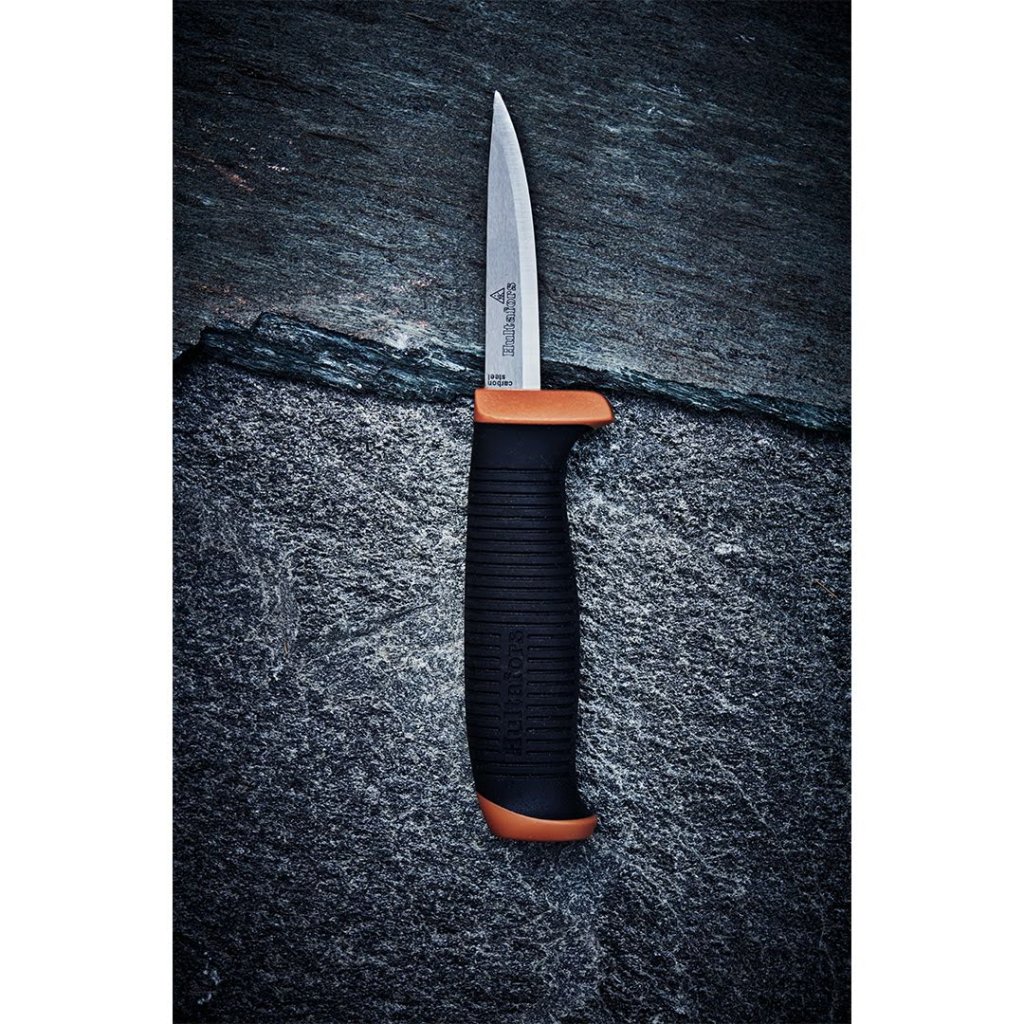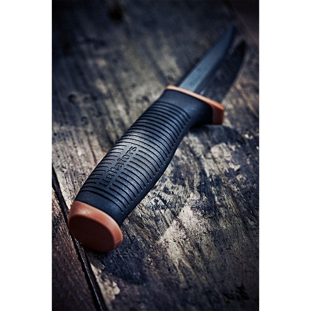 Srdcem nože je 2 mm silná čepel vyrobená z vysoce kvalitní japonské uhlíkové oceli, která zaručuje mimořádnou odolnost a dlouhotrvající ostrost. Každá čepel prochází vícestupňovým procesem broušení a je finálně leštěna na koženém pásu, což jí dodává extrémní ostrost hned po vybalení. Rukojeť je vyrobena z odolného PP plastu a potažena vrstvou Santoprene, která zajišťuje vynikající přilnavost a pohodlí i při dlouhodobé práci. Součástí je praktické pouzdro, které lze snadno připevnit na opasek nebo knoflík u pracovních kalhot, takže máte nůž vždy bezpečně po ruce.
