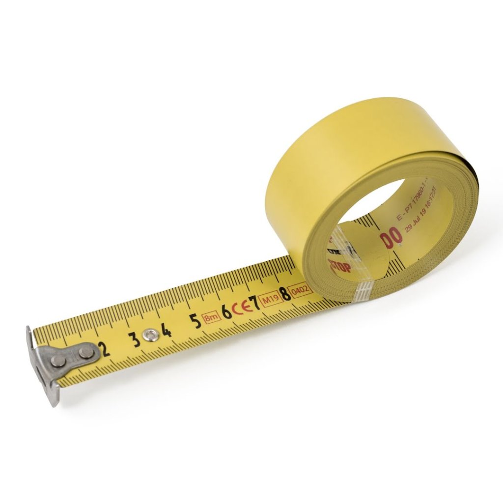 Samotná páska je vyrobena z kvalitní oceli a opatřena výraznou žlutou barvou a polyesterovou ochrannou vrstvou, která ji chrání před oděrem a korozí. Díky vysoce přesnému inkoustovému tisku na obou stranách pásky je odečítání hodnot v milimetrech rychlé, snadné a bezchybné z jakéhokoli úhlu. Spolehlivost měření dále zvyšuje nerezový koncový háček a zesílená destička, které zajišťují přesný nulový bod.