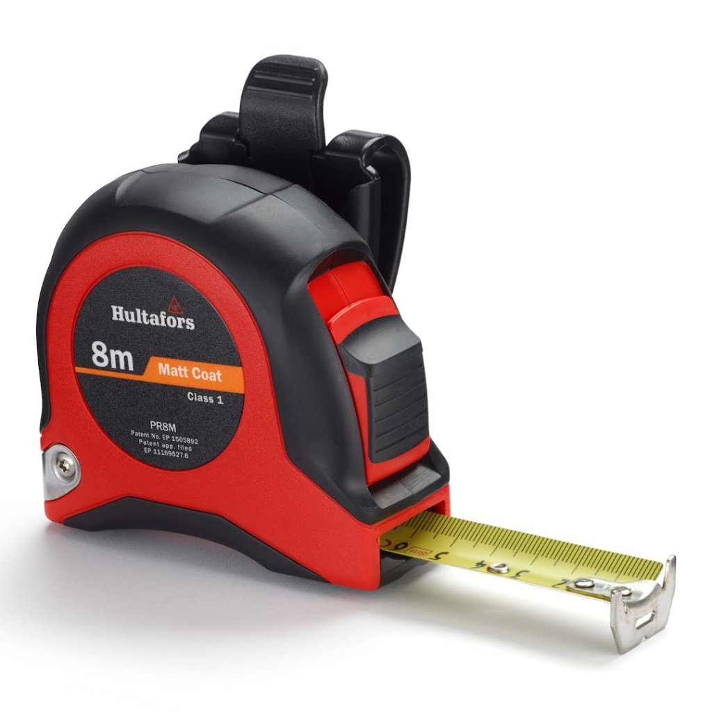 Metr je certifikován podle evropské normy Třídy I, což je zárukou nejvyšší možné přesnosti pro profesionální použití. Praktické detaily, jako je kovové očko pro zajištění metru při práci ve výškách nebo možnost snadné výměny pásky, potvrzují, že HULTAFORS PR 8M byl navržen s ohledem na skutečné potřeby a bezpečnost na staveništi.