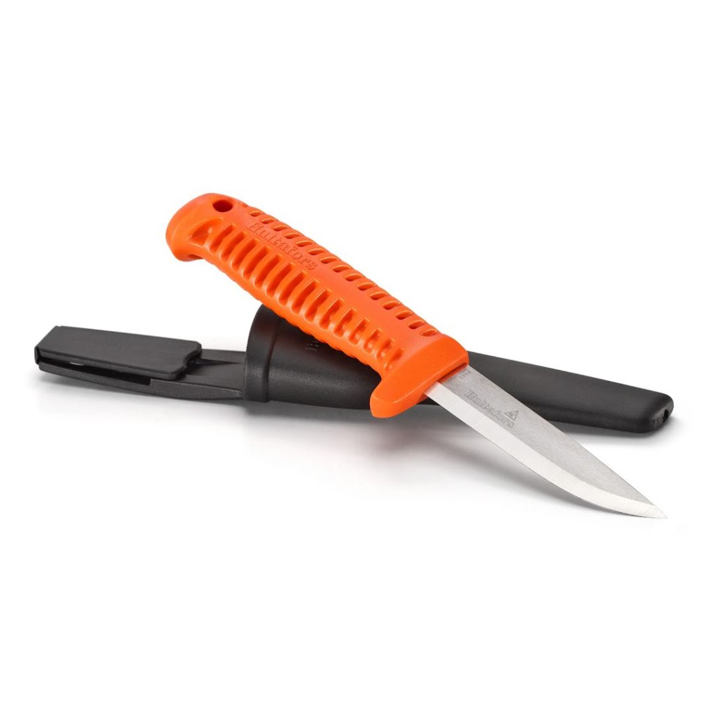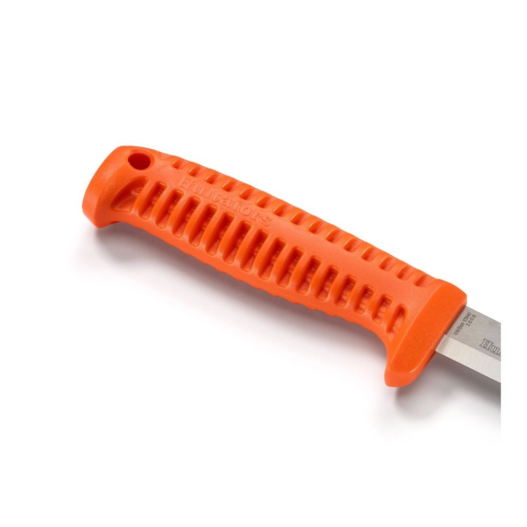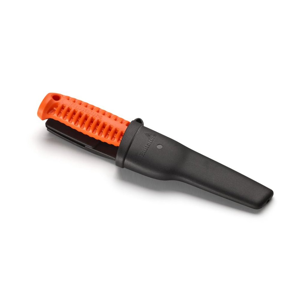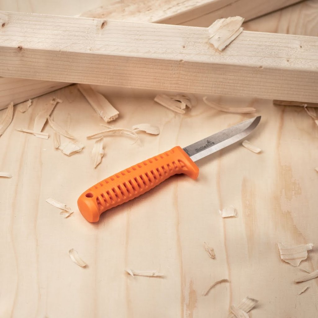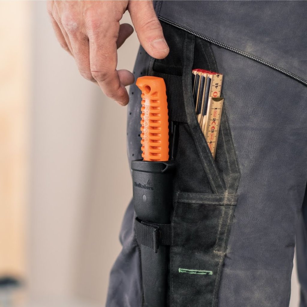 Srdcem nože je 2,5 mm silná čepel z vysoce kvalitní uhlíkové oceli, kalená na tvrdost 58–60 HRC. Tato úprava zaručuje mimořádnou odolnost a dlouhotrvající ostrost i při náročném používání. Rukojeť je vyrobena z inovativního a vysoce odolného bioplastu, který nejen poskytuje pohodlný a bezpečný úchop, ale jeho promyšlený design zároveň šetří materiál. Pro zvýšení bezpečnosti, zejména při práci ve výškách, je rukojeť vybavena praktickým otvorem pro připevnění řemínku.