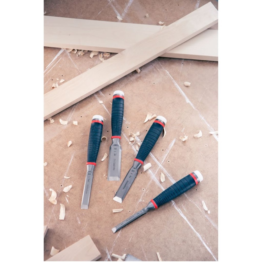 Pohodlí a bezpečnost při práci zaručuje ergonomická rukojeť ze Santoprenu, která poskytuje pevný a bezpečný úchop i při silných úderech. Životnost dláta dále prodlužuje vyměnitelný nylonový úderník, který efektivně tlumí nárazy. Součástí každého dláta je chytré pouzdro, které nejen chrání ostří, ale lze jej také snadno připevnit na opasek nebo knoflík u pracovního oděvu. S touto sadou získáte spolehlivého partnera pro precizní a efektivní práci se dřevem.