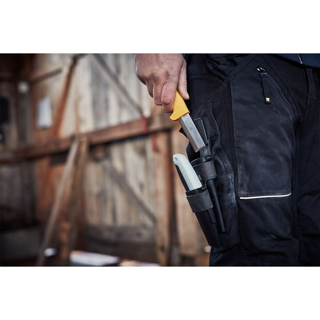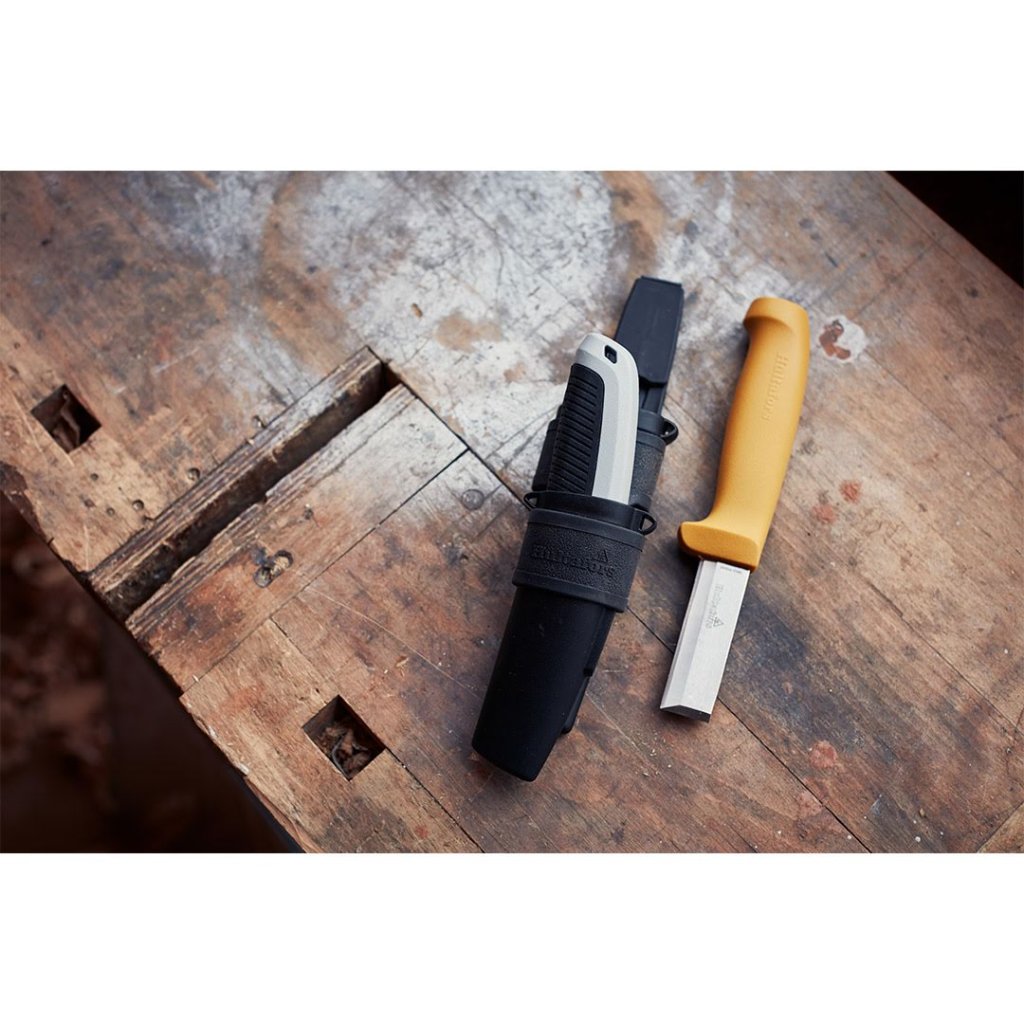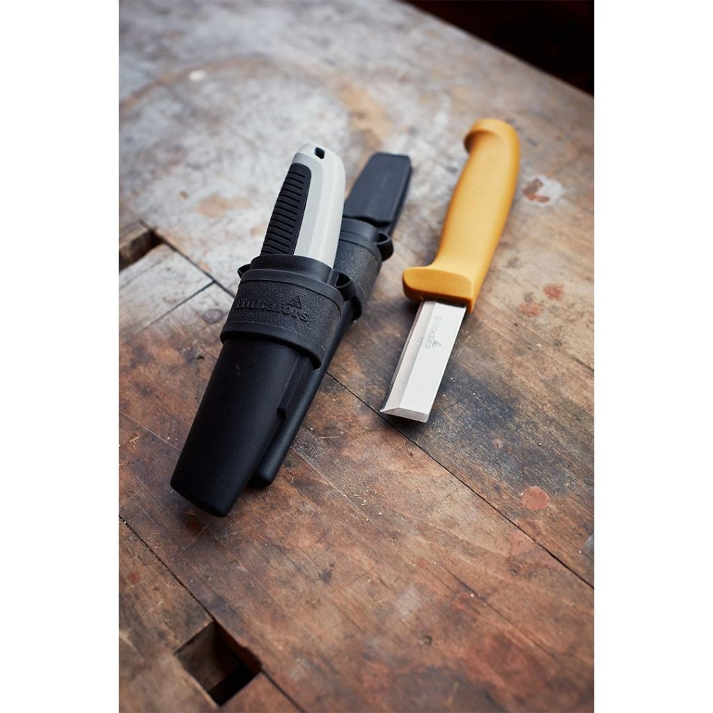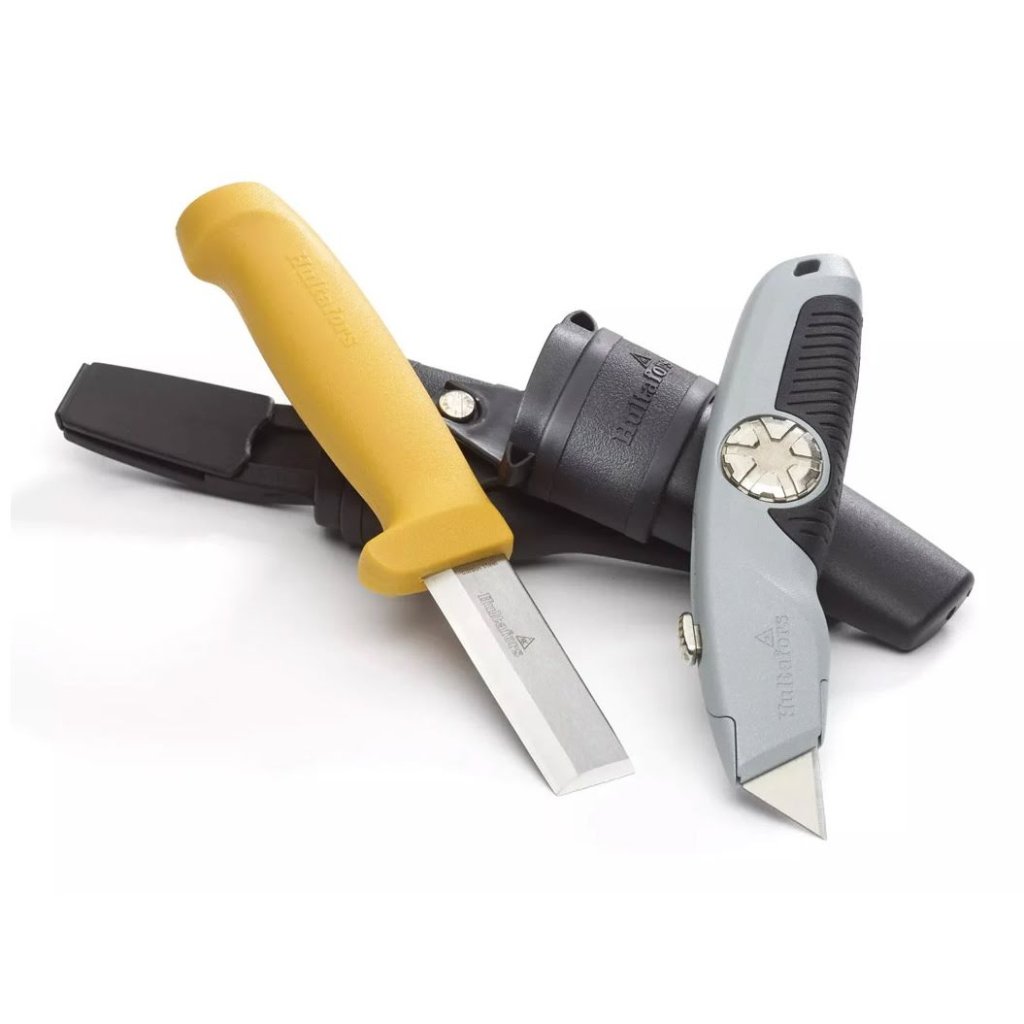Součástí sady je robustní dláto-nůž STK, jehož čepel s broušeným V-ostřím je navržena pro silové i precizní úkoly. Doplňuje ho univerzální nůž URA s ergonomicky tvarovanou rukojetí, která zajišťuje bezpečný úchop a dokonalou kontrolu při řezání náročných materiálů, jako jsou sádrokarton, koberce či podlahové krytiny. Oba nástroje jsou bezpečně uloženy v dvojitém pouzdře z vysoce odolného PP plastu, jehož konstrukce je zpevněna nýty a doplněna elastickou smyčkou pro dlouhodobou spolehlivost.