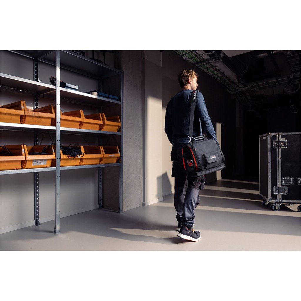 Díky 48 specializovaným kapsám a držákům budete mít každý nástroj na svém místě. Vnitřní uspořádání doplňuje kontrastní červená a černá podšívka, která usnadňuje rychlou orientaci. Praktické detaily, jako je vnější držák na svinovací metr, karabina na klíče, poutka na tužky a průhledné kapsy, dále zvyšují efektivitu práce a umožňují bezpečné uložení citlivého vybavení.