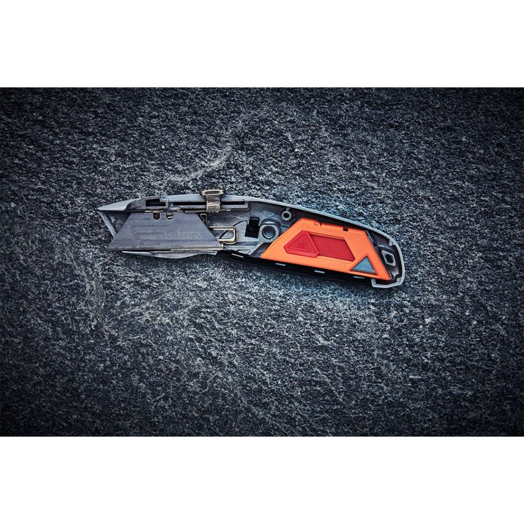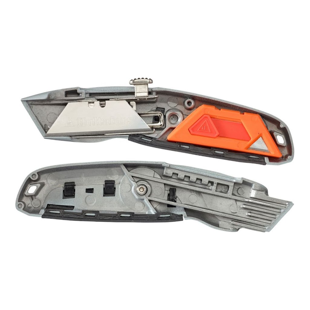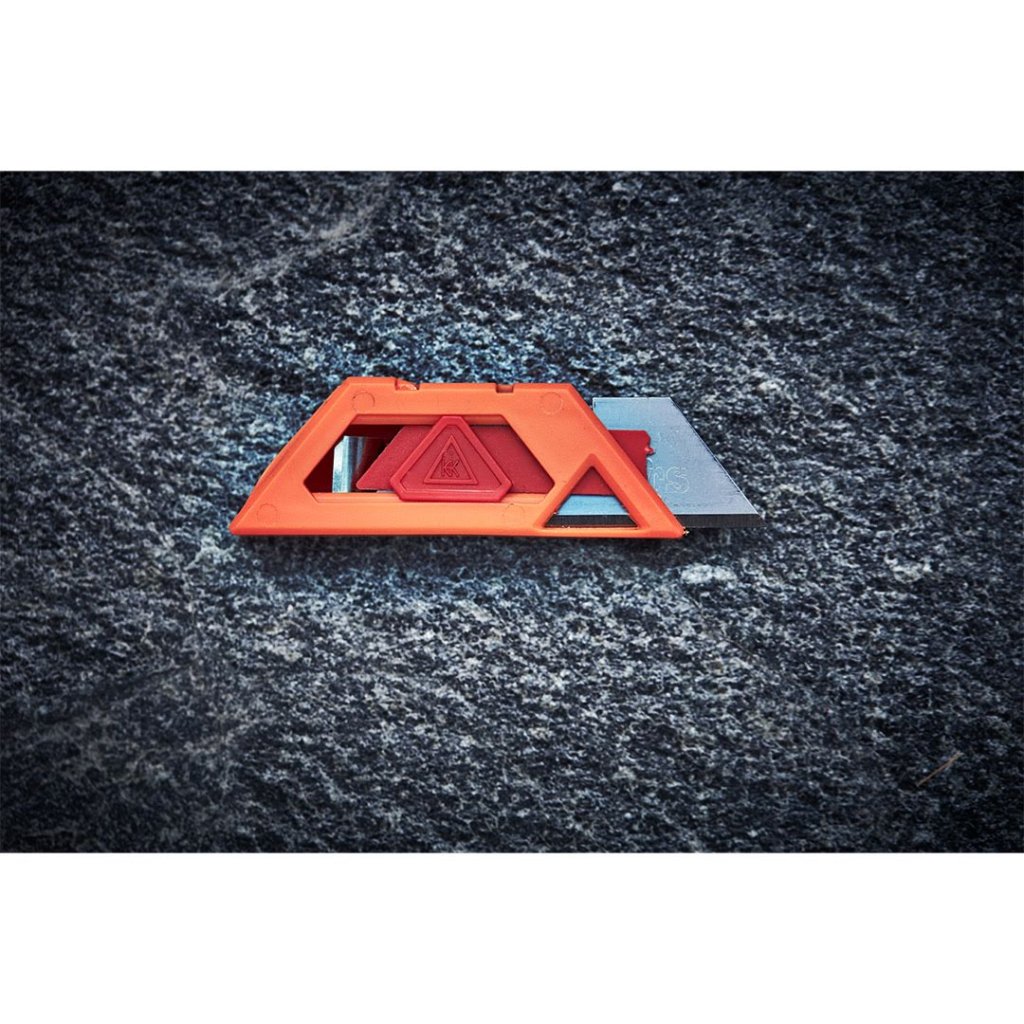 Každý břit je vyroben z vysoce kvalitní uhlíkové oceli SK5 a zakalen na tvrdost 58–60 HRC. Tím je zaručena dlouhotrvající ostrost hrany i při opakovaném a náročném používání. Součástí balení je praktický zásobník s pružinovým mechanismem, který umožňuje snadnou a bezpečnou výměnu břitů, minimalizuje prostoje a zvyšuje efektivitu práce. Pro maximální bezpečnost na pracovišti lze použité břity jednoduše zasunout do zadní části zásobníku, což pomáhá udržovat pořádek a předcházet zraněním.