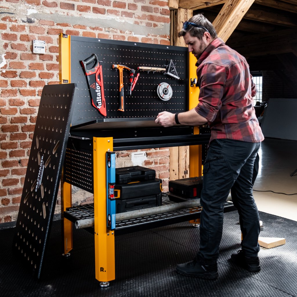 Stěna za stolem slouží jako multifunkční organizér s háčky, lištami a držáky, které umožňují snadno pověsit různé nářadí a příslušenství tak, aby bylo vždy po ruce a přehledně rozmístěné. Nabízí dostatek prostoru pro uložení nářadí, součástek i dalších potřebných věcí.